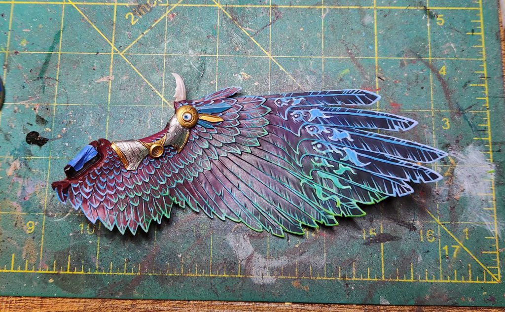Night Lords Blue and a mix of that with black. This was mostly done with wet-blending, though I'd later come back and paint the inner feathers with Screamer Pink more concretely - the edge highlighting work I did covers up a lot of the transition errors anyways.