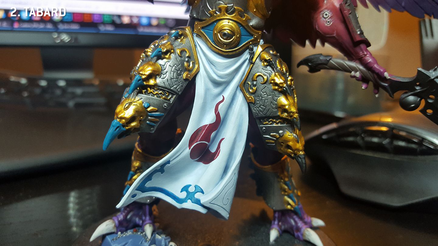 Reaper Pure White, trying to make the transitions as smooth as possible. The Tabard icon is freehand done with Screamer Pink, then shaded with a mix of Screamer Pink and Nuln Oil. The whole thing was a tremendous pain with the folds and probably the most nerve-wracking part of the process, since it had to be done over a finished tabard. The blue sections were painted with