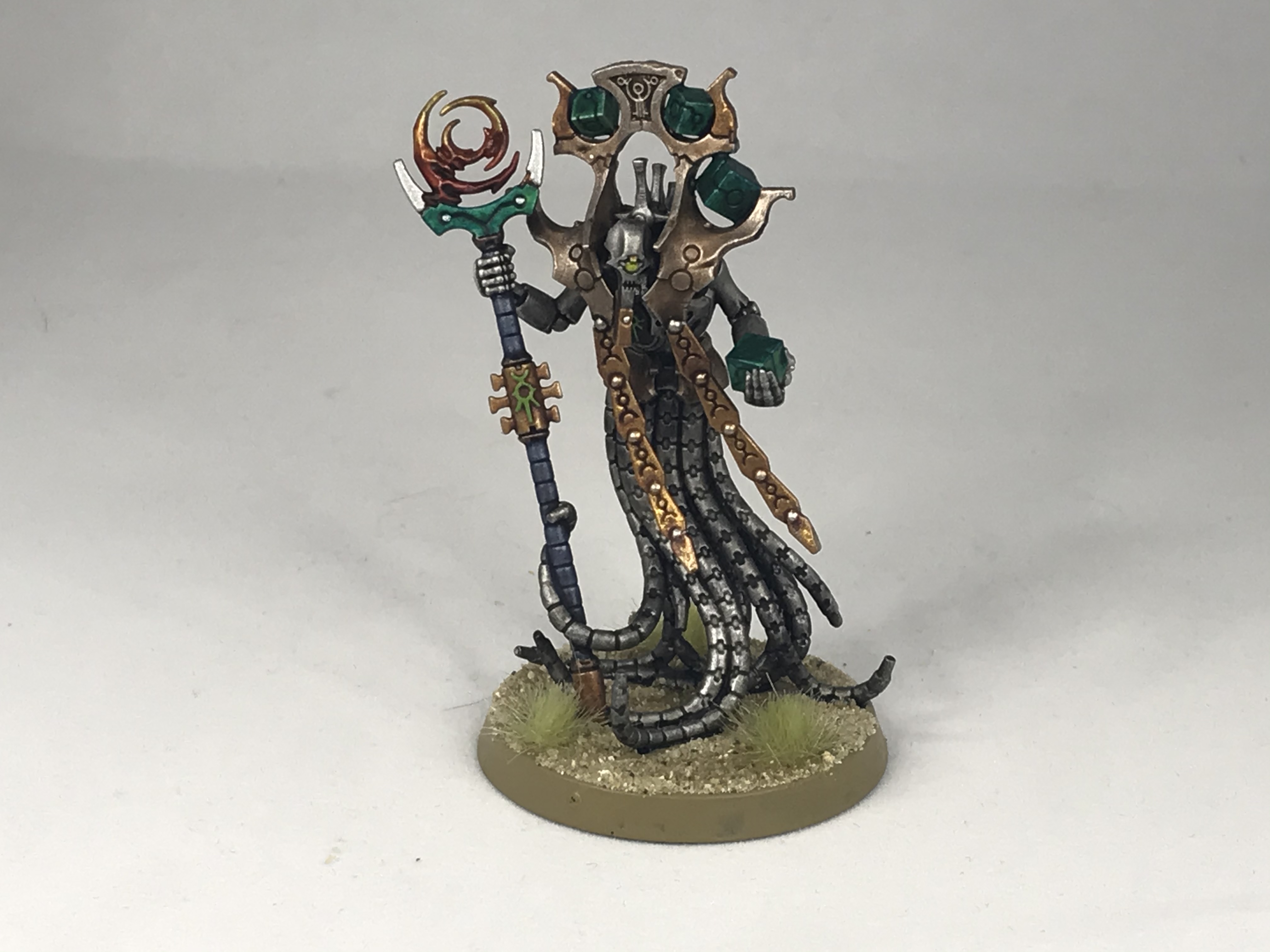 From here we're nearly done. The gold parts get washed with Druchii Violet, then drybrushed with Gehenna Gold and then lightly drybrushed on the edges with 1:1 Retributor Armour/Stormhost Silver. The models have what are clearly "energy orbs" on a few places, so these I hit with Stormhost Silver then thinned Ork Flesh Contrast. For the Plasmocyte, I gave it an evil glowing red eye using Blood Angels Red Contrast over the silver instead. Finally, as these are still non-royalty among the Necrons, they get a black chest runeplate, with the rune itself picked out with Moot Green. A dot of moot green on each of the eyes, and the models themselves are done.