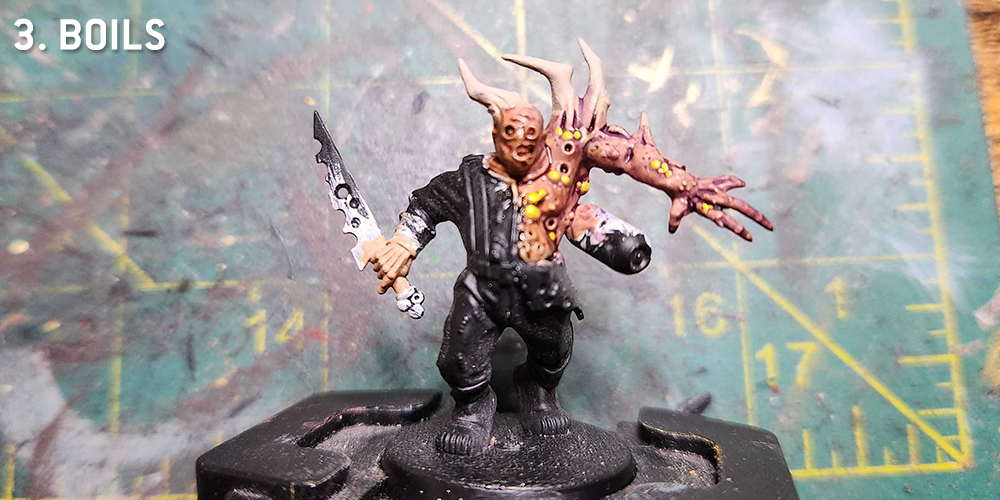 Fuegan Orange and Agrax Earthshade (the re-highlighted with Jokaero), and I paint the pustules at this point with