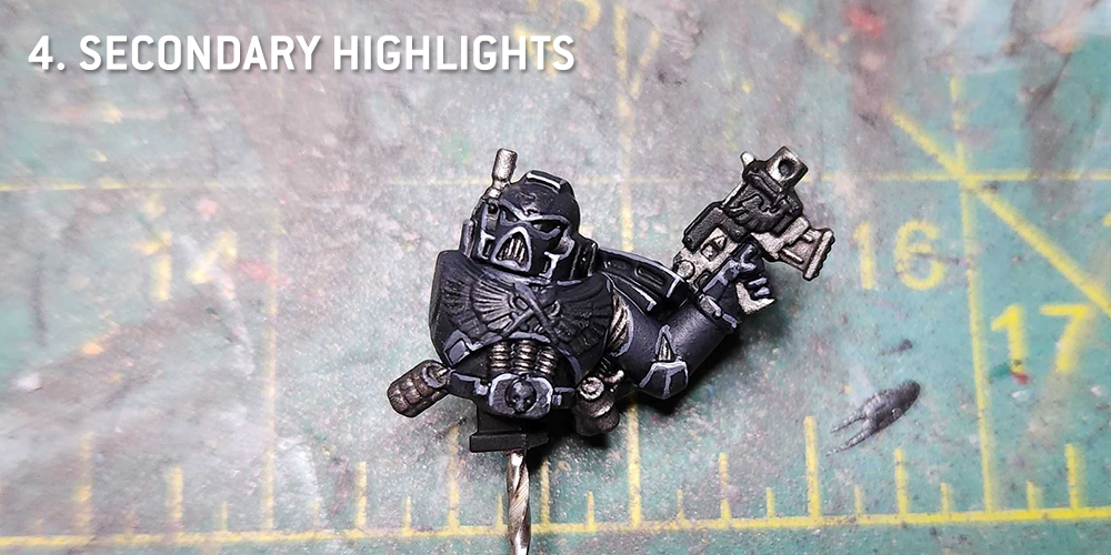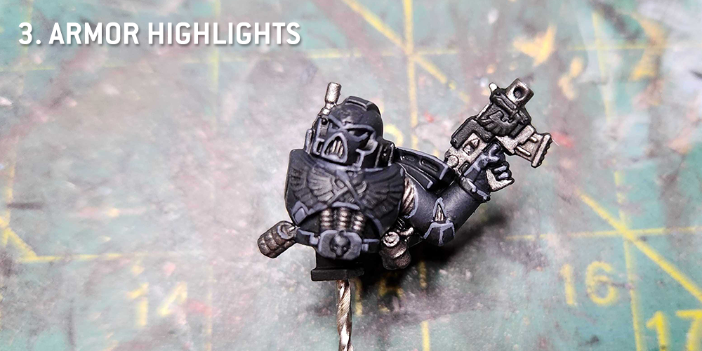 I start by priming the model black, then I highlight it, doing mixes of Abaddon Black and Corvus Black until I get to pure Corvus black on the raised areas. This gives the model a nice gradient look that will make it stand out more than just using flat black.