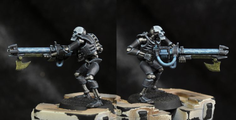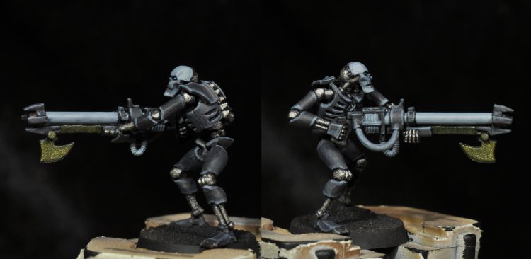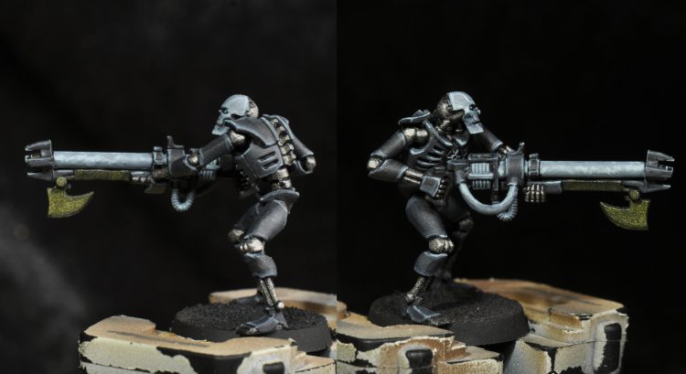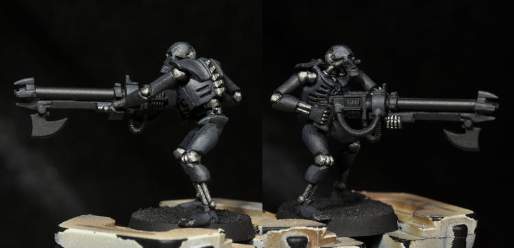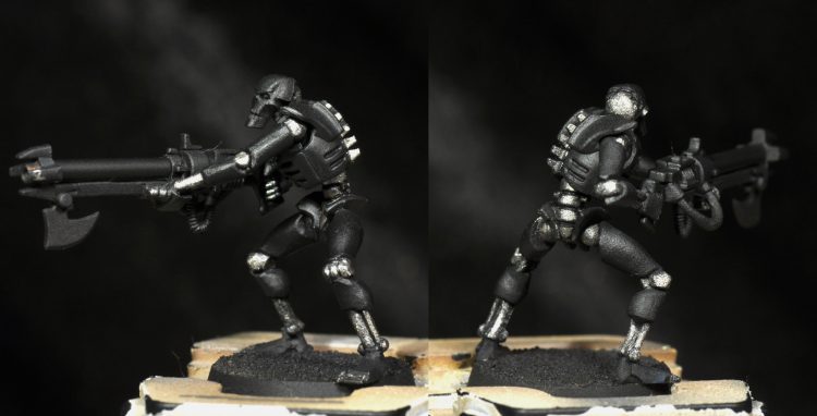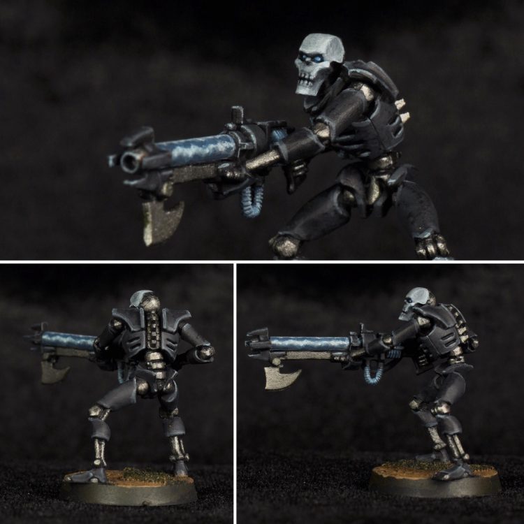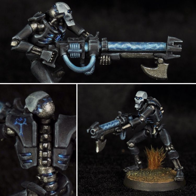 Second edge highlight: Stonewall Grey 1:1 with Basalt Grey and a small amount (in the 10-20% range again) of Temple Guard Blue. This is a finer highlight along all the edges. Then the same color was used to paint the whole face again along with the gauss tube, wires, and coils on the gun. The wires hanging out of the chest were painted this too, along with the raised portion of the chest emblem.