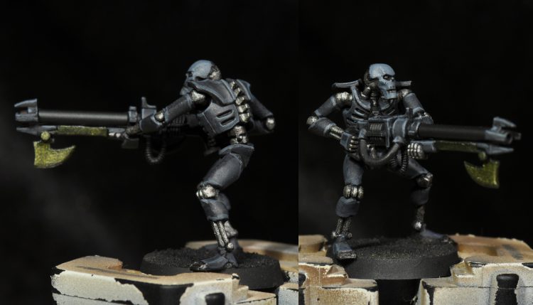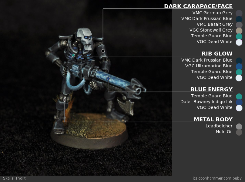 Base: The armor/carapace/face and gun housing were all based with a mix of German Grey with little bit of Dark Prussian Blue mixed in for a bit of tint- in the range of 10-20%. I don't think this is strictly necessary, how blue you want it (if at all) is up to personal taste.