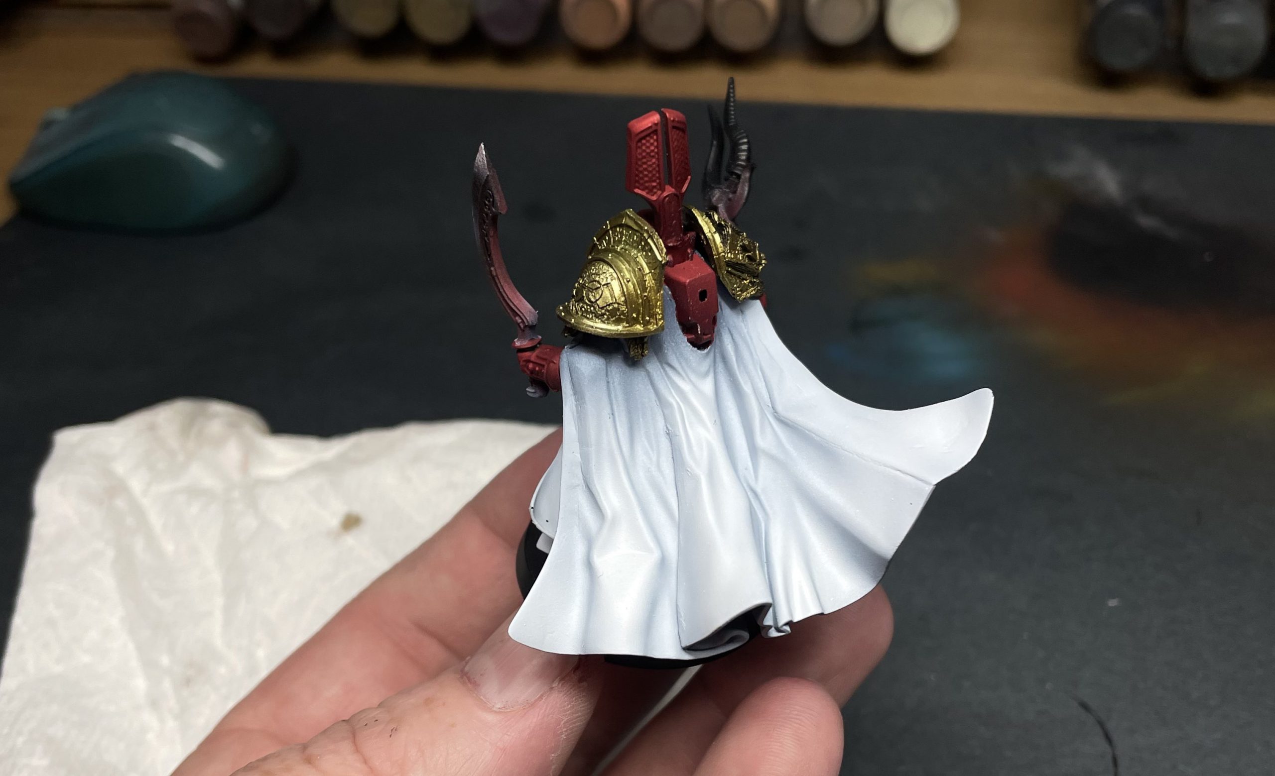 This is all done with an airbrush. Do not touch the cloak with a brush! Spray directionally into the shadows after the first progression through the recipe to even out the blends.