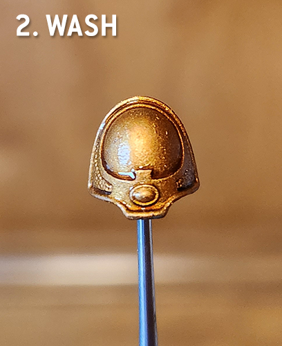 We want to hit the recesses on the gold and give it a more burnished look, so we wash the entire model. The GW method for this uses