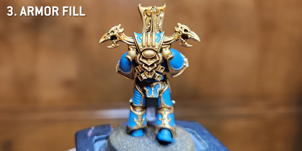 When it comes to painting the Thousand Sons there are two schools of thought: In one, you base the model gold and paint the armor panels, and in the other you paint the armor first and then paint the trim. There are advantages to both - when you base the model gold you can save a lot of time and make it way easier to paint the model as a whole, and get some great edge highlights on your trim, at the cost of having better/easier gradients on the armor.