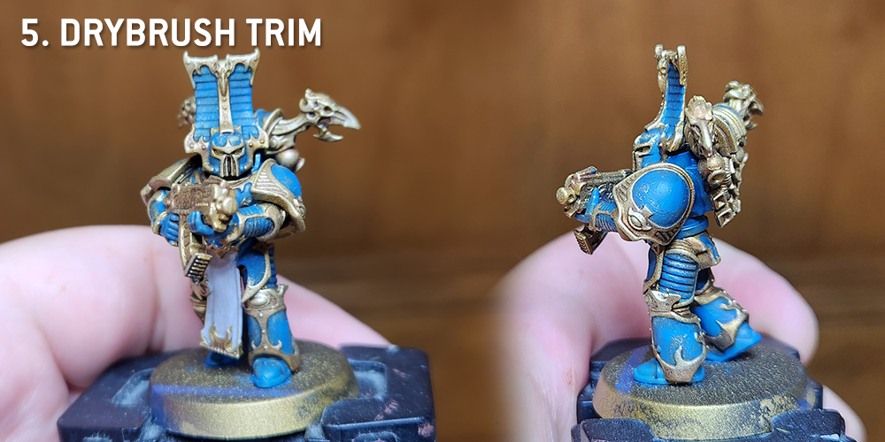 Now it's time to drybrush the trim. Using a small drybrush - I use the Artis Opus series D small brush for this - drybrush the edges of the trim with a lighter gold. The GW method for this uses