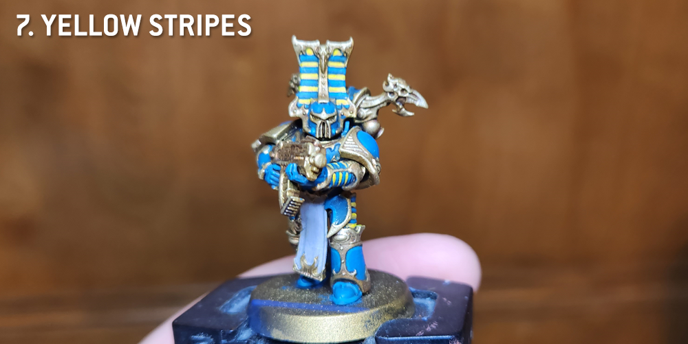 Ahriman Blue. You want to use this to hit the raised edges of the blue parts, and if you're feeling adventurous, you can do thin lines against the edges of the panels to help it stand out from the trim. Remember when you do the stripes you don't need to highlight all of them - this is the step when you'll figure out which stripes are blue and which are yellow.