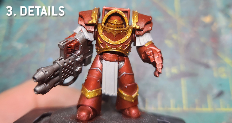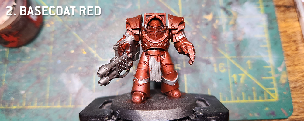 What do you do if you mess up later? It's nearly inevitable that at some point you're going to get another color of paint on your carefully prepared red later. If that happens your only real recourse is to paint over the area with Leadbelcher/Runefang Steel as appropriate, then cover that with Contrast paint again.