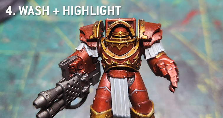 Contrast Blood Angels. The idea here is that the paint is thin enough to let the metallic paint underneath shine through, giving the model a shimmery look. This is resistant to edge highlights however, as they tend to dull the look. You're basically counting on the natural lighting in the room to do more of the work than the paint and that has its advantages and disadvantages.