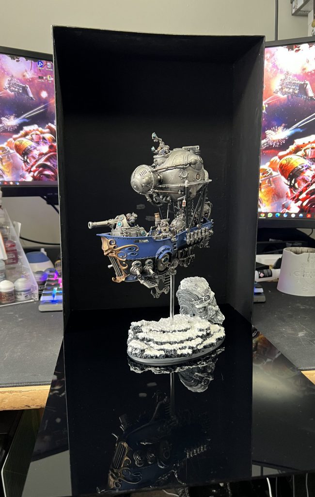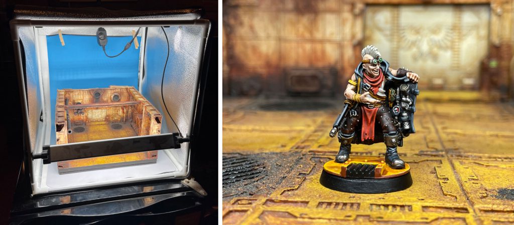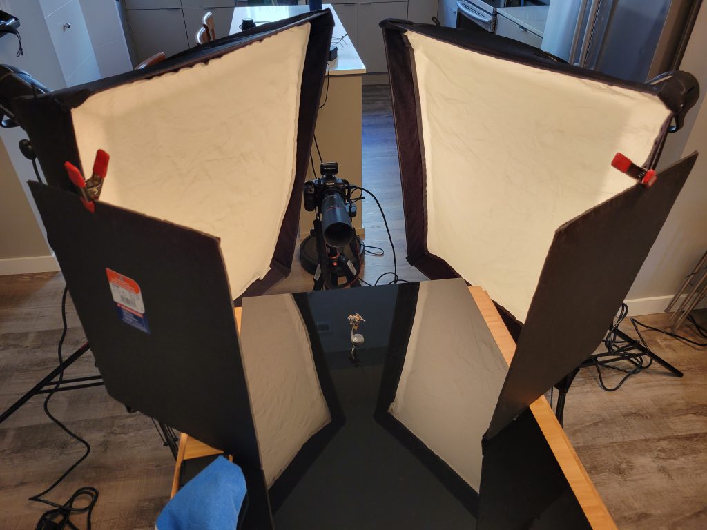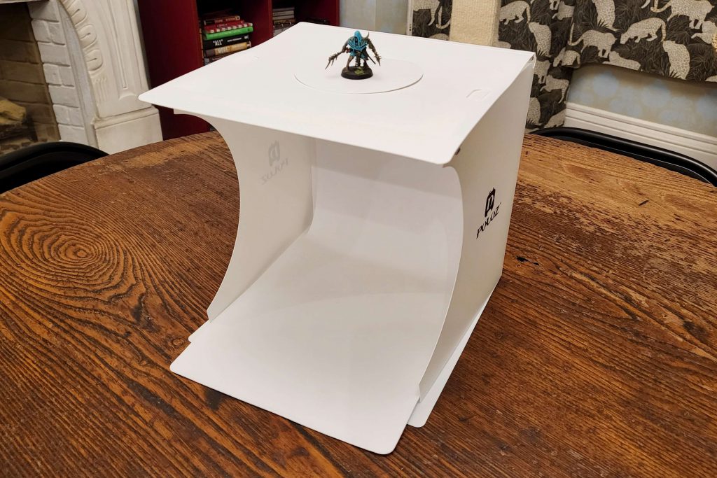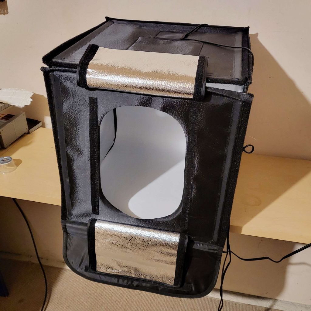 Travor Photo Box that can be found on Amazon for less than $60 USD. I use my iPhone 12 Pro to take pictures and do minimal editing within Instagram before I post. The photo box has 2 LED light bars, that I have set to above-and-slightly-forward and one directly in from-of the minis. The reflective side material helps to bounce the light to the sides of the minis to reduce weird shadows or glare.