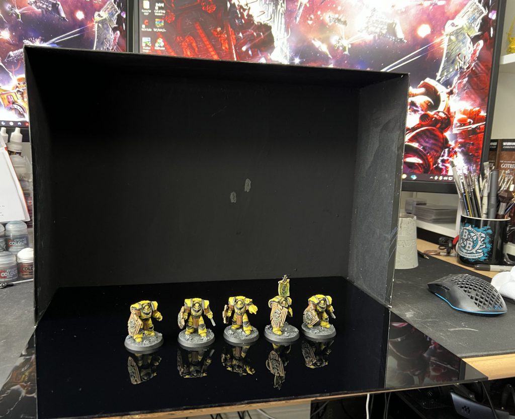 That's it. I took inspiration from Soggy by using the inside of a large box as a back drop; the new Horus Heresy box set works great since it's already black on the inside but really any large box works since I painted the inside as well. I wanted to try and make the backdrop darker so painted it with Musou black (the blackest black paint) to absorb more light. I painted two coats of this on the inside of the box and it definitely helps to make the background darker by default - if it's actually worth the cost at £50 per 100ml (I picked it up for £40) however is up for debate, and this step isn't strictly necessary. Thankfully I needed one pot, and used maybe 4/5 of it, so still have some left for...something I guess. The lamp I have is off-camera in these pics but it's a long bar of LED's that I also use for painting. You don't want the light directly on the model so I raise it up and away when taking pictures so it doesn't create any weird shadows.