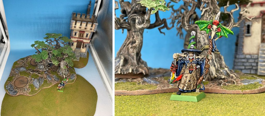 When shooting 40k stuff, I'll grab some quickly-identifiably 40k terrain, battle scape, containers, etc and place them in to build some depth and create a setting. Age of Sigmar is the same idea, building a setting with universe-correct terrain grounds your mini.