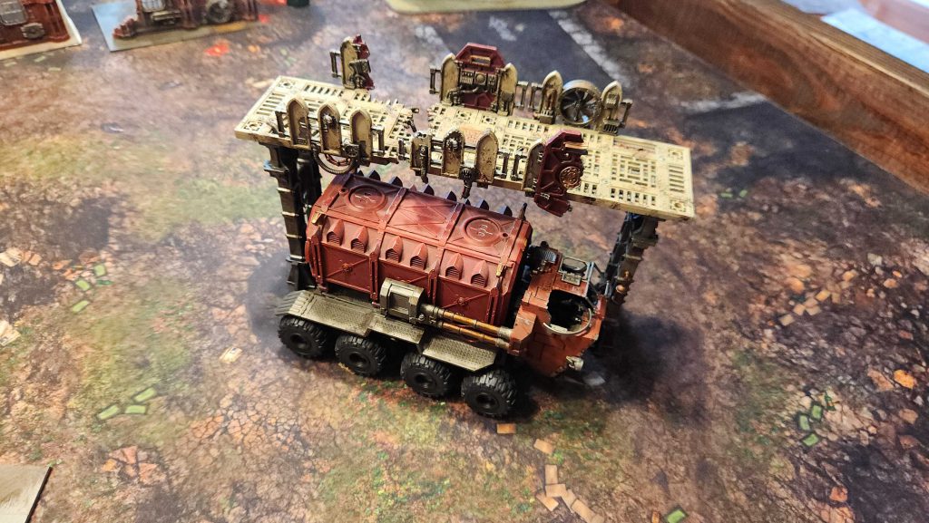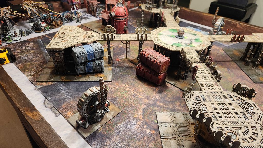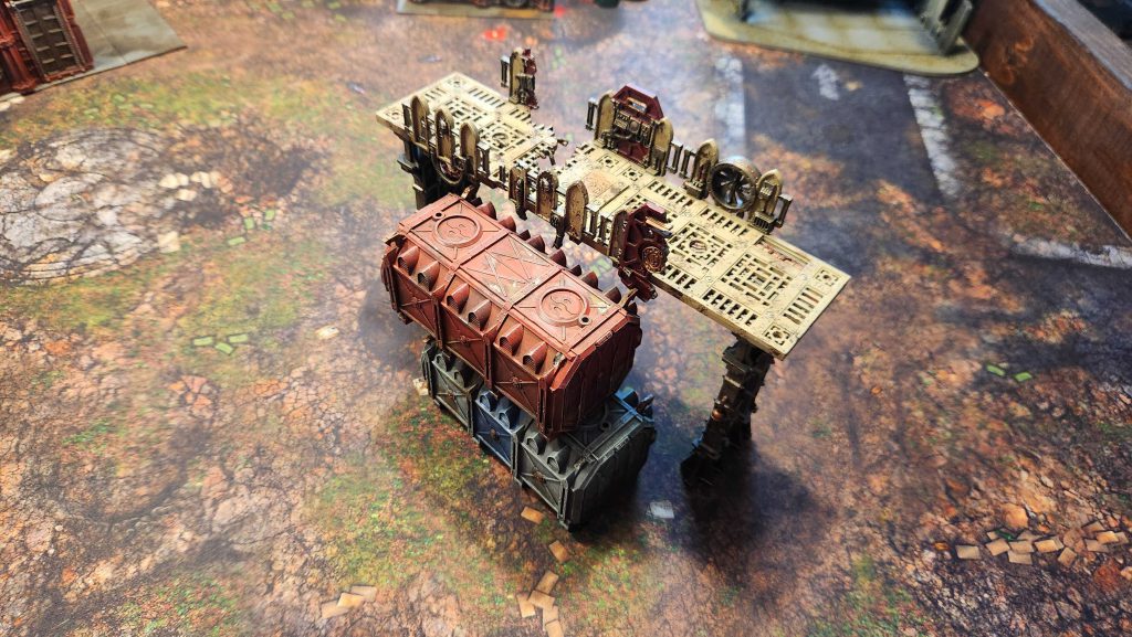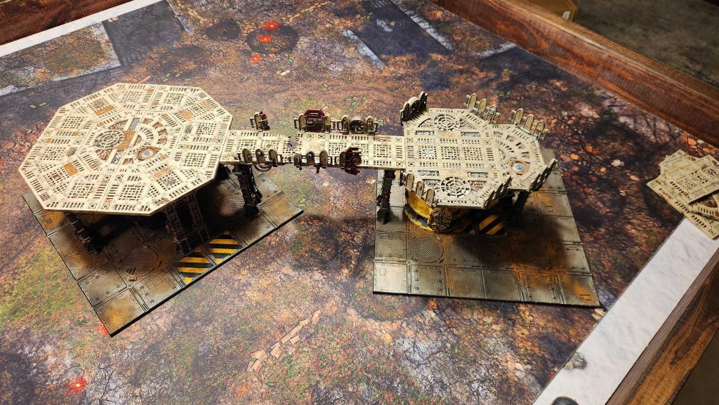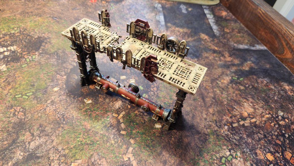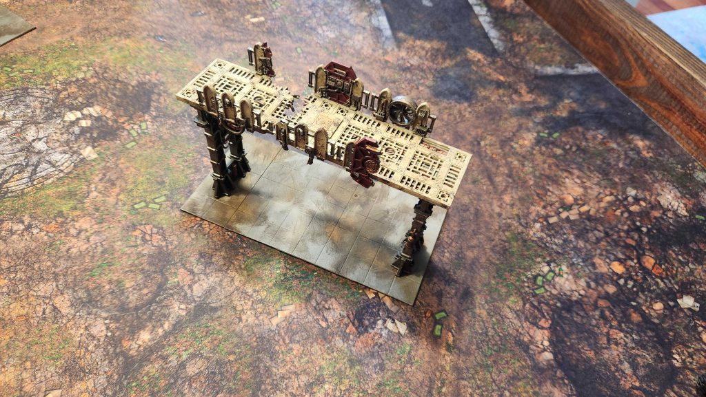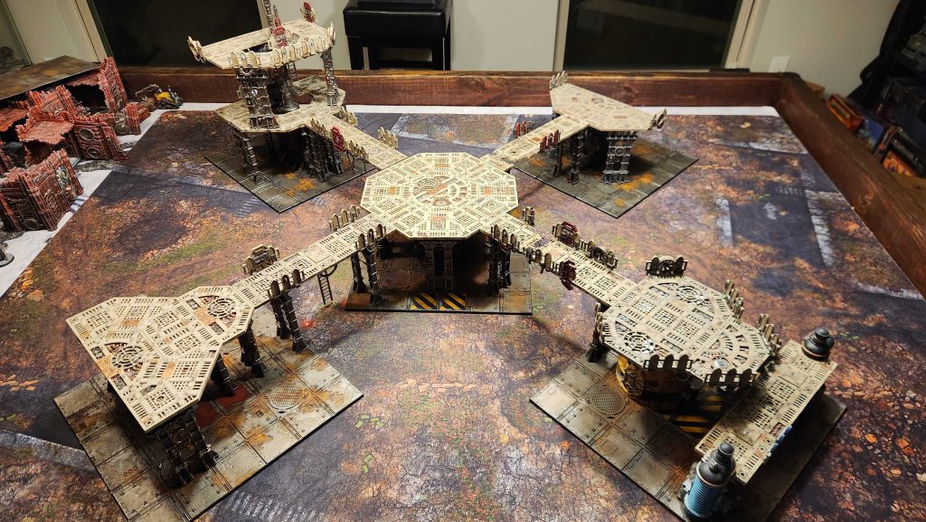 and its entire objective control area to really work. That's a lot of Sector Mechanicus terrain - in this case it's a forge, the octagonal plates on top of it, and four of the bending walkways around it, supported by struts.