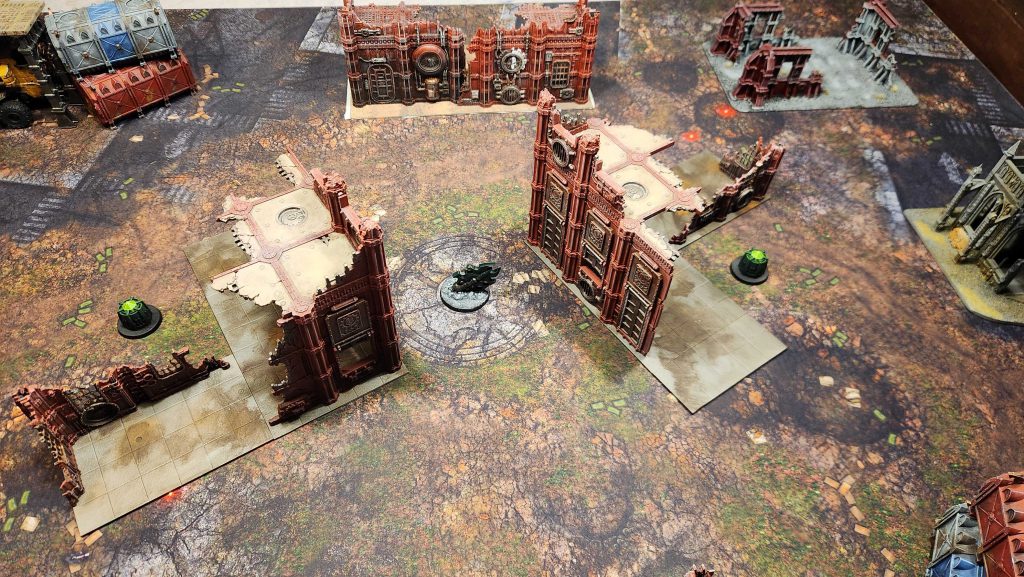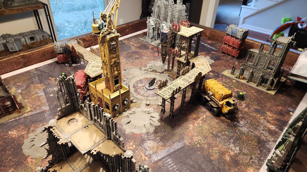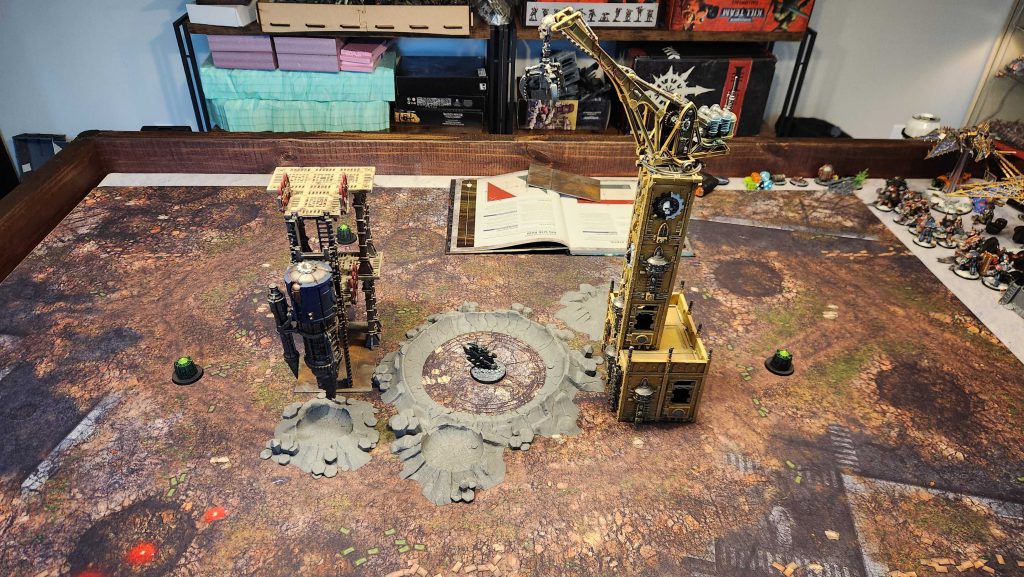 For all its faults, if you have enough Sector Mechanicus terrain, you can do some really cool stuff. Specifically, you can create a game of 40k that's multi-layered and truly three-dimensional, rather than just feeling like a flat game where the models could have been cardboard tokens. You can create raised areas where different units can skirmish. With that in mind, we're going to create a terrain layout with this in mind, putting the center objective on a raised platform at mid-table.