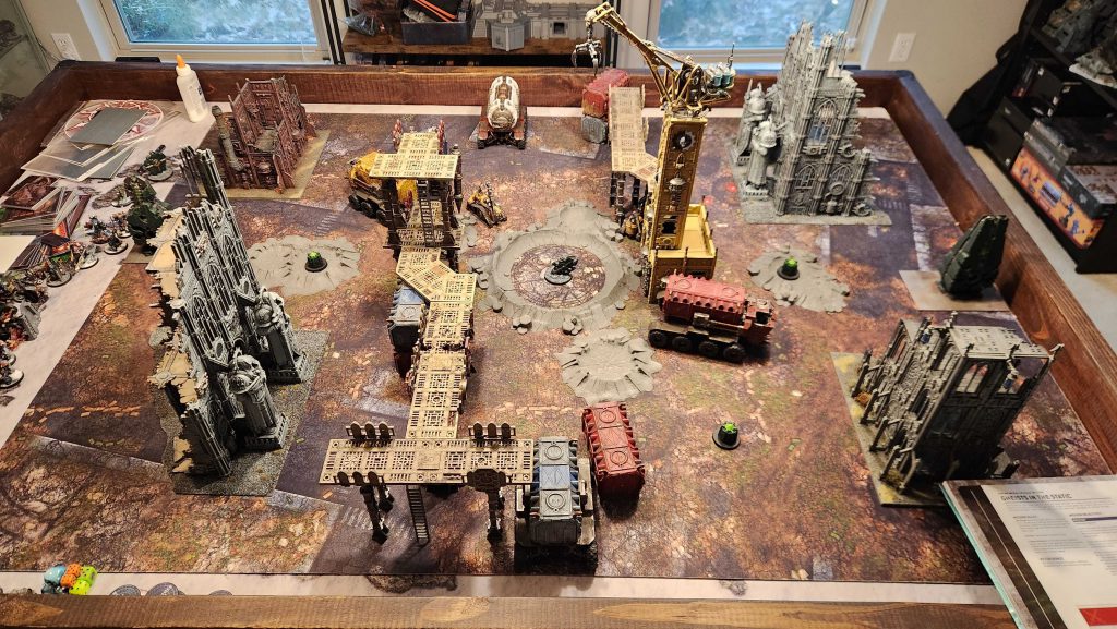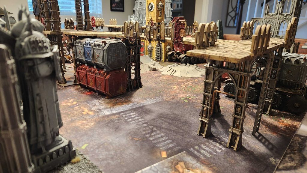 Flipping this around solves a key problem: Now units have to walk through to the middle of the table if they want to contest that objective. In a similar fashion to what I did on the last map, I drop crates and terrain pieces on the sides of the table to block sightlines. I'm also using shipping containers and ridgehaulers to to block sections of those walkways so they aren't just completely open. The final result is a table that has the visual effect I need without being insanely open. It'll work very well for the Crucible of Battle deployment this mission uses.