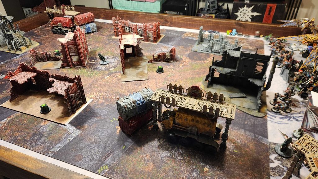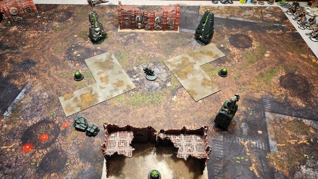 Note: Originally I planned to use terrain pieces - specifically a Convergence of Dominion - to help denote the circle, but this just didn't work with the terrain I put down. The lanes to get to the center of the table were too tight for vehicles so I removed them.