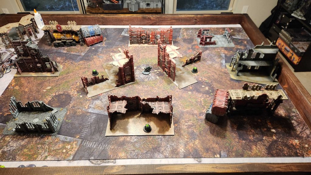 This more or less ends up being the finished table. It's more asymmetrical than I usually prefer, but I can live with some of that in Narrative play, especially if we're in a scenario that has a predetermined attacker/defender and player going first. This layout should work for most deployment maps, though I like it the least for Sweep and Clear - but it still should do just fine there.