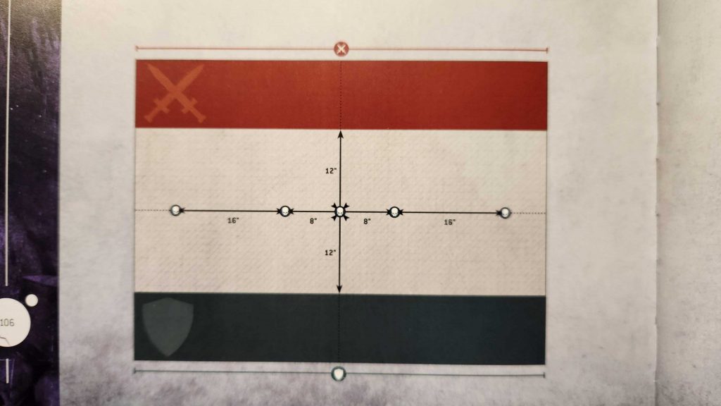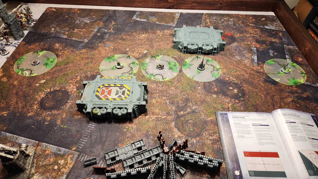 Supply Raid is a mission using Dawn of War deployment - always tough to work with - and a novel layout for its objective markers. In this mission all five are deployed along the center line and removed during the battle. It's meant to represent a battle over vital supplies.