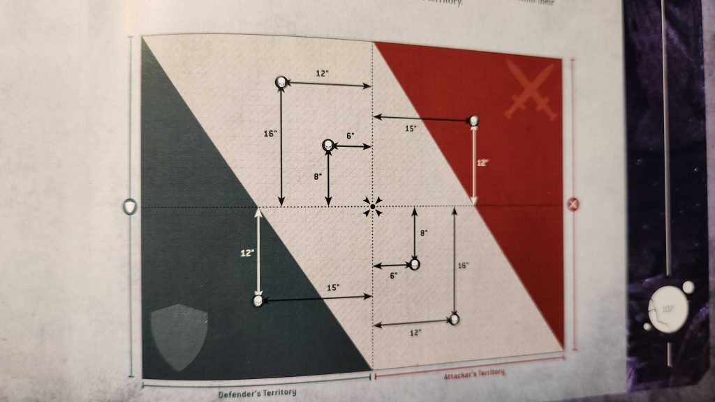 Again, working with Nachmund terrain is always a challenge but it's doable. Here I opt to put one tall building in the middle of the table with corner ruins on 12x6" terrain bases. Those should provide hiding spots for infantry to hold home objectives while letting the objective be touchable from the other side of the area terrain. The Infopurge action finishes at the end of your opponent's next turn so it needs to be something you can safely do without it just being a death sentence for your unit.