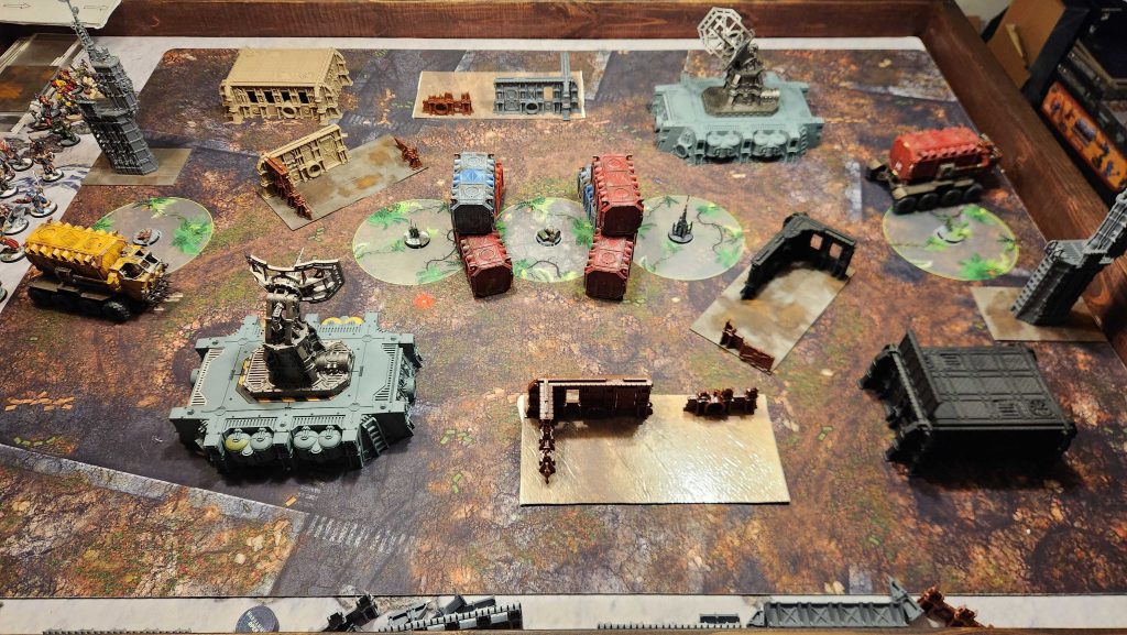 Munitorum containers really end up being a decent working solution for the middle here, giving us separation between the middle objectives. It might make more sense here to put them in an L shape to break up the middle a bit and I'd probably come back and do that on a second pass here.