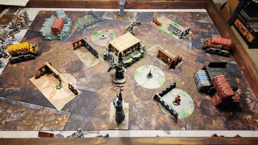 Whenever we build a layout we want to do a few things: First, create hiding spots for deployment, second, reduce lines of sight between the objectives on the table, and third, create staging points for melee units to move up the table.
