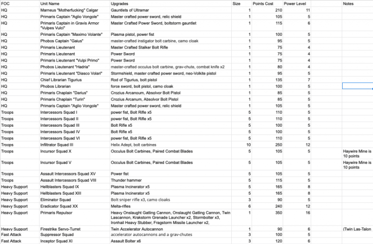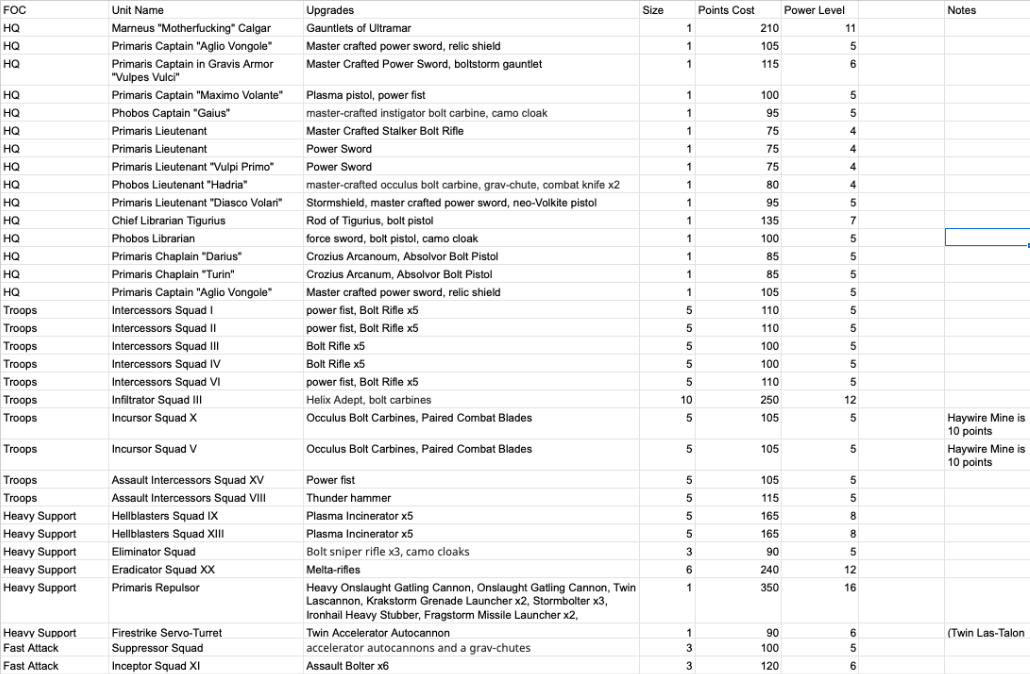 With all this stuff already written out, their upgrades paid for, and their points costs calculated, it's easy to build armies by just copypasting unit entries into a new spreadsheet. With the wargear already written out, you've got a readymade reference for what your units have. It's easy to forget that third Stormbolter on your Repulsor or that one special pistol you gave some unit sergeant somewhere, especially if you're not going full WYSIWYG.