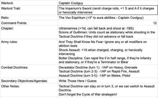 Look at all that! And that's just for Ultramarines, the dang poster boys of this game. You could also consider adding page numbers to any of these notes when applicable, which would be especially helpful when playing against new players or in a tournament when you might need to explain some rules in more detail. You could even leave the secondary/objectives area blank and fill that in by hand when your game starts if you don't know what you'll be up against.