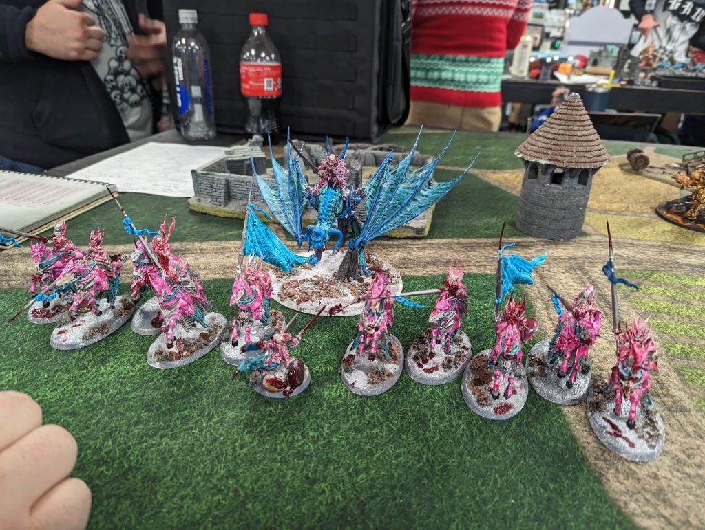 Southern Fried Gaming Expo, a humbling event where I one a single game against a Slaves to Darkness player. Let this be the hour where we draw swords together. Our opponents had a slaves to darkness list and two megas. One of the villains we were up against had charged Kragnos into my harmless laser eye wurrgog prophet at