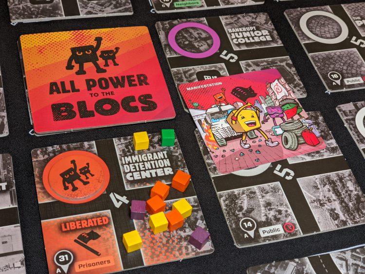Bloc by Bloc is a semi-to-fully cooperative game—designed by T.L. Simons—that recreates urban protest movements