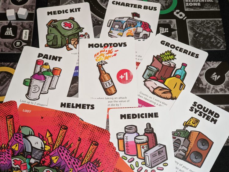 Cops restrict your movement, and since each cop on a tile with your blocs automatically removes a cube it’s difficult to keep protestors on the streets. You also risk attracting cops if you take Loot or Occupy actions; on a d6 roll of 1-2 you summon a riot cop or draw a Police Ops card, which may irrevocably alter your turn. Even working cooperatively, you will make tradeoffs and sacrifices that hobble you.