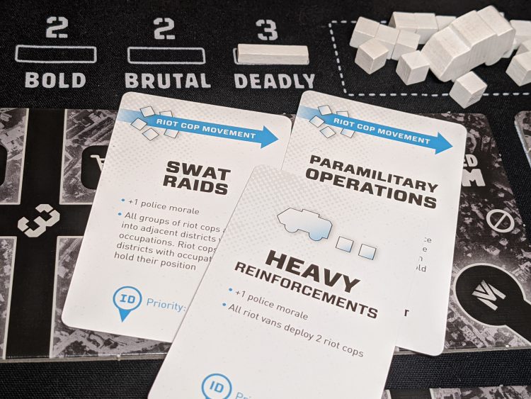 The deck is further stacked against you due to Police Morale, which measures how many Police Ops cards (1-3) you must draw and resolve. Generally police morale only lowers when players attack to remove riot cops or riot vans. If you ignore an emboldened police force for too long, the Police Morale Track is a blunt assessment of how bad it gets.