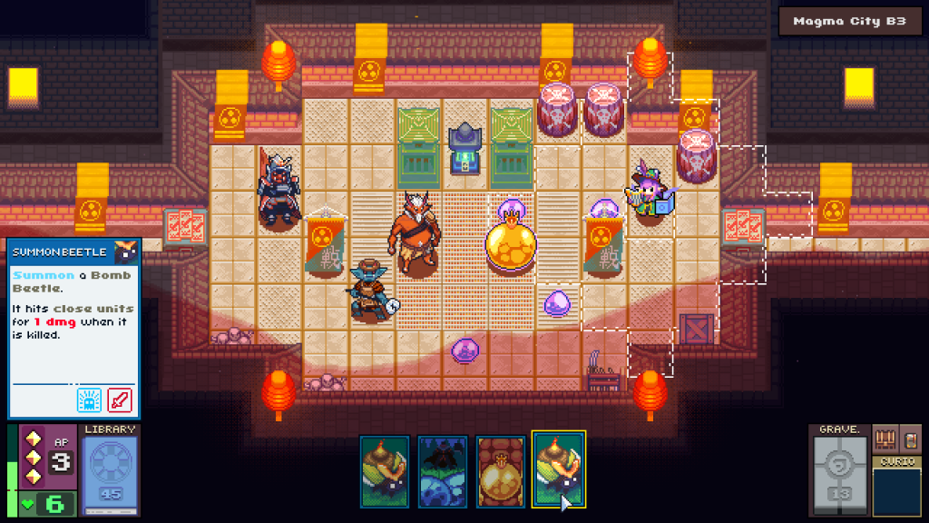Outside of the deck-building, the gameplay loop is based around navigating the battlefield with your limited AP, which you also use to attack and cast spells. Enemies follow predictable patterns, letting you really think out your turns to optimize attacking and defending yourself, while adding randomisation via the cards you draw from your deck, which don’t redraw from encounter-to-encounter, forcing you to use them if you want to draw new ones.