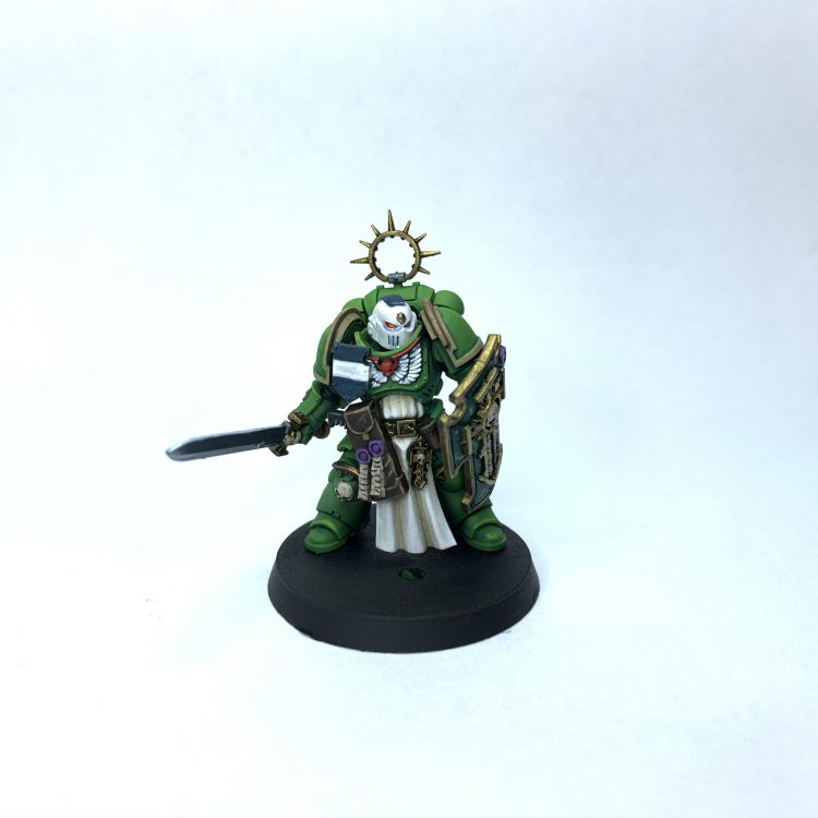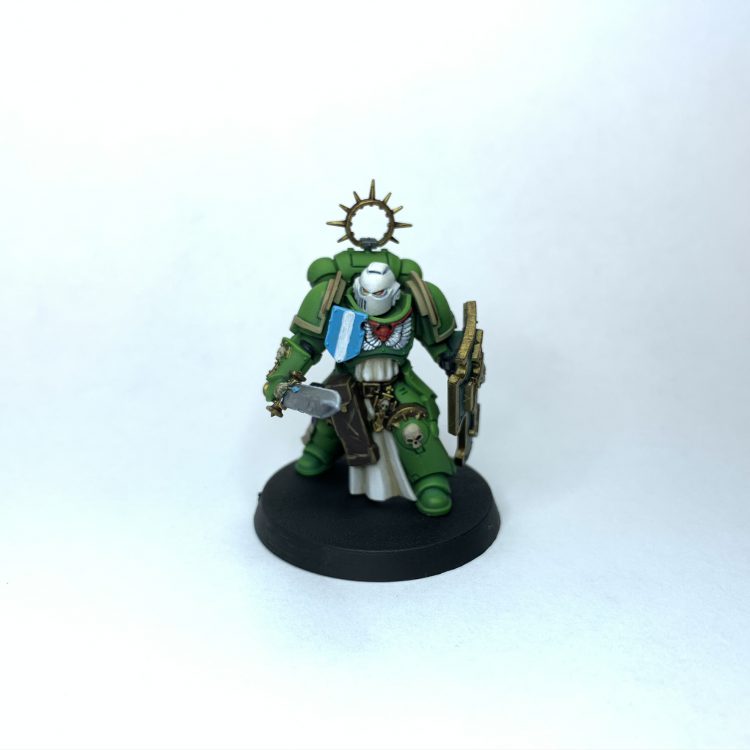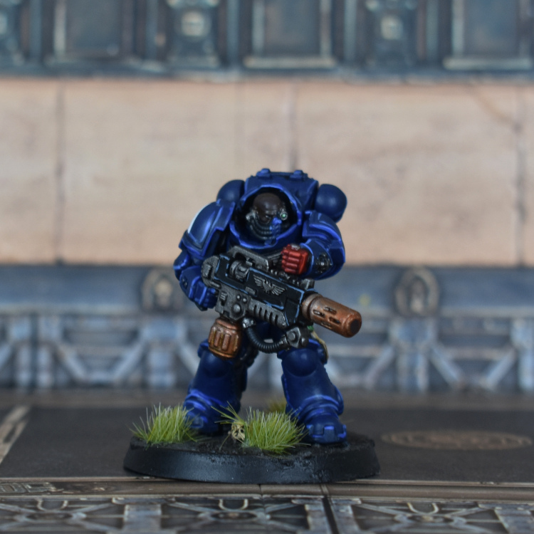 The most recent thing I've finished is the Bladeguard Ancient, the second of my share of the characters. I was fairly cold on this guy until I realised his robes cover like 80% of his armour, and the thing I dislike most about painting Space Marines is edge highlighting, so he jumped to the top of the queue! Once I'd started on him I really enjoyed this guy - he has a ton of different things going on and fun details, and the skeleton banner is Extremely 40k.