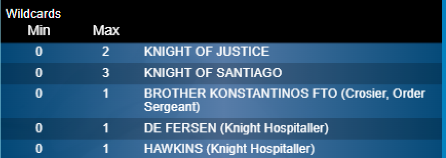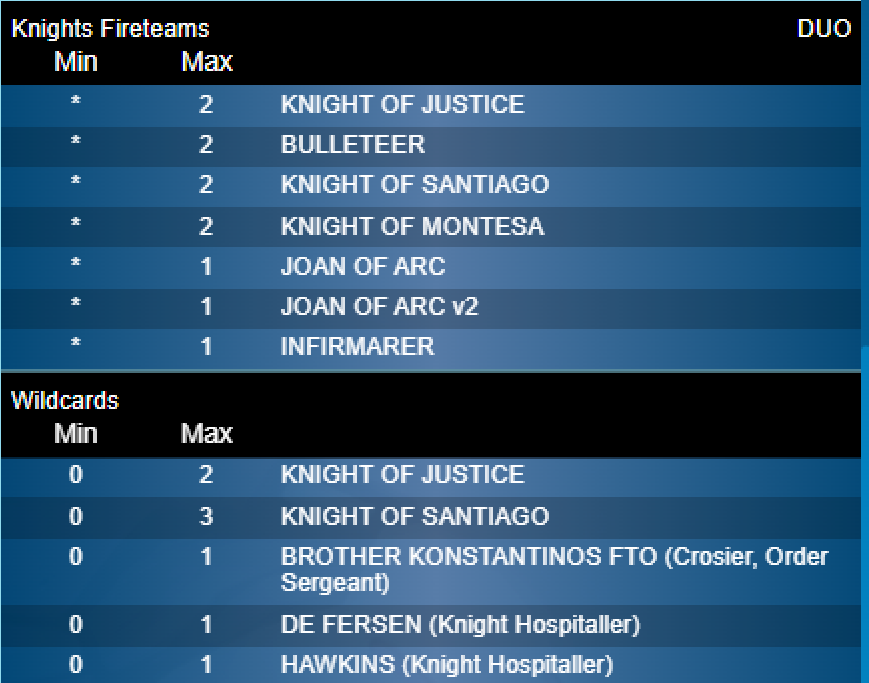 You have great flexibility to Duo together almost any two Knights in the Sectorial, except for Teutonic and Hospitaller Knights, but including the Hospitaller characters (De Fersen & Hawkins) or Joan.