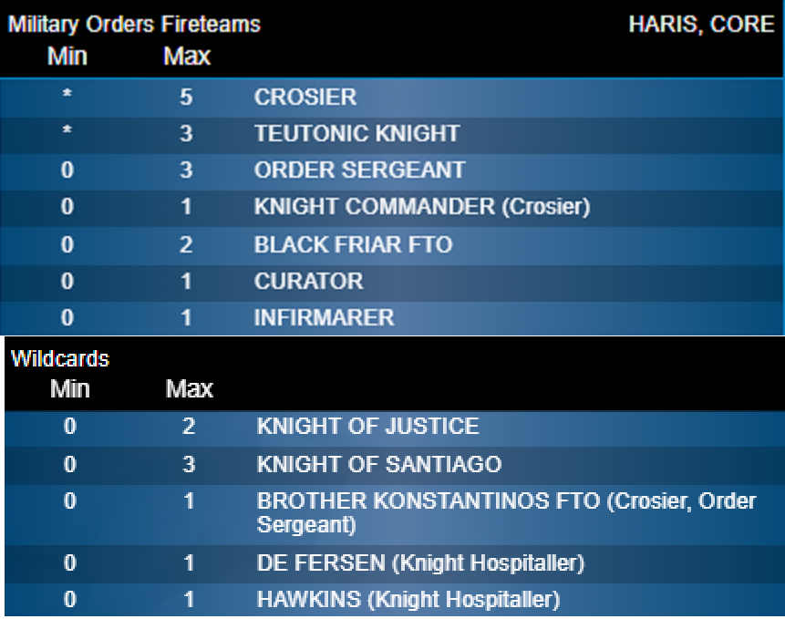 How did these changes affect Military Orders specifically? The previous firepower options that could be added to Core teams (notably Missile Launchers, or the Black Friar HRL) can still be added but are less effective. Unlike some lucky factions, Military Orders have no way to add elite gunfighters to cheap teams and still gain the full bonuses.There are plenty of ways to Fireteam strong knights with cheaper light infantry support, but no full bonuses here. There is also only one option for a full ‘pain train’ of 5 Heavy Infantry knights with the full bonuses, based around Knights Hospitaller.
