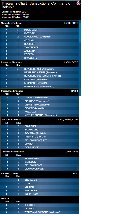 Bakunin still has good options for big Core teams with level 4-5 bonuses. We may still see Level 5 Reverend Fireteams with a Moira (and/or Kusanagi) firepower piece, Cenobites for close assault, Custodier hacking and Healer or Agatha medical support. Just as in N4, the raw combat power of 5 Riot Grrls (with or without Avicenna and/or Fiddler) could be even stronger. Both these compositions suffered in N4, but are still powerhouses.