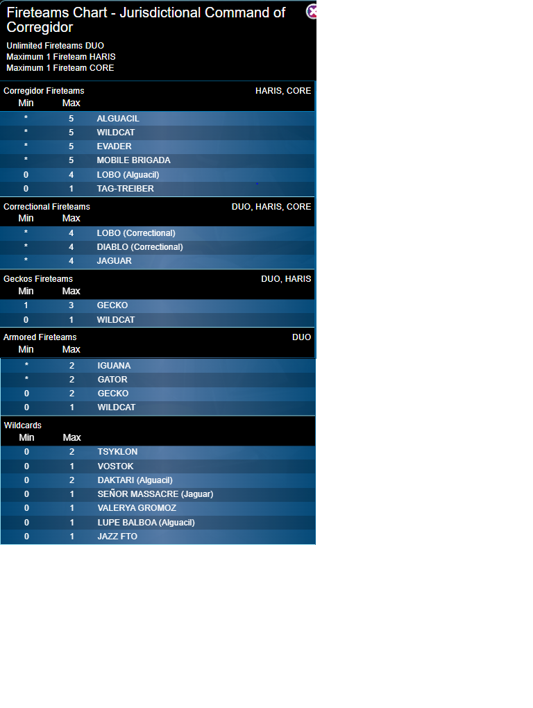 Hey look, it’s the same two categories. No fun unique compositions for you, Corregidor! Haris (and 3-model Core) teams are something we’re more keen on for N5 CJC. It’s the natural size for a Lobos/Diablos team. It also works well for 2 Brigada (or 2 EVAders) and some sort of Wildcard with a different capability. We’re also looking at 2 Alguaciles plus a better model with a gun - it’s the cheapest way to get +1SD.