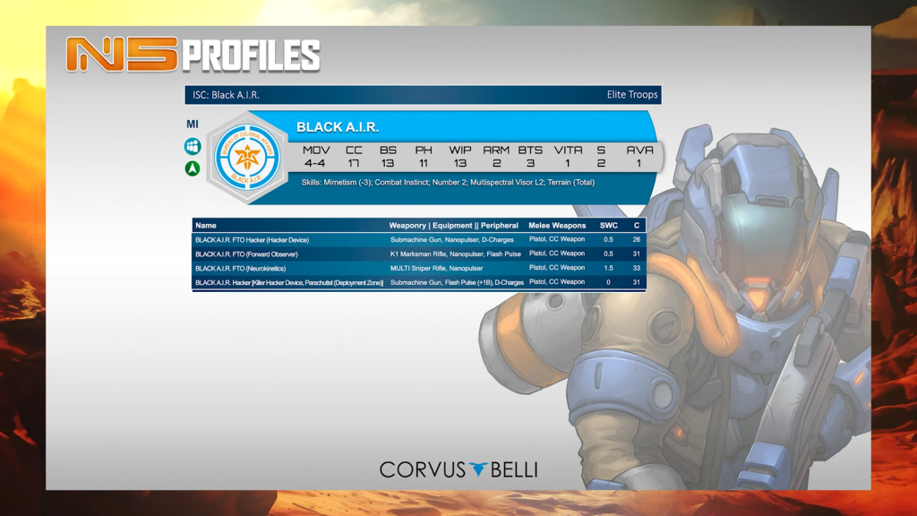 God damn that Black AIR. Again we see some really interesting and complex profile design, with each profile changing dramatically from the others due to special skills or equipment added. The most expensive is the Neurocinetics sniper, which has got to be the gold standard for hard stop AROs going forward.