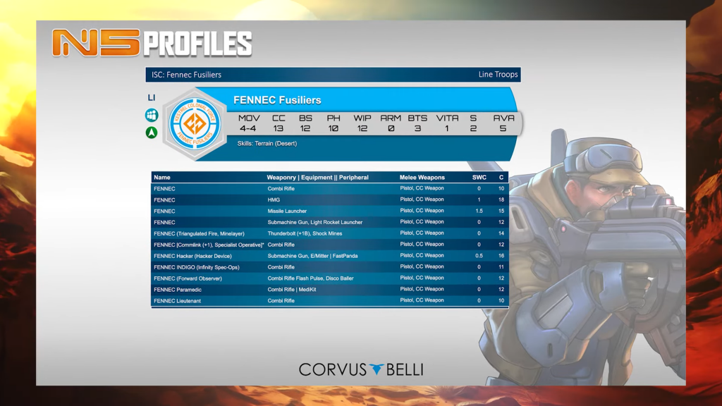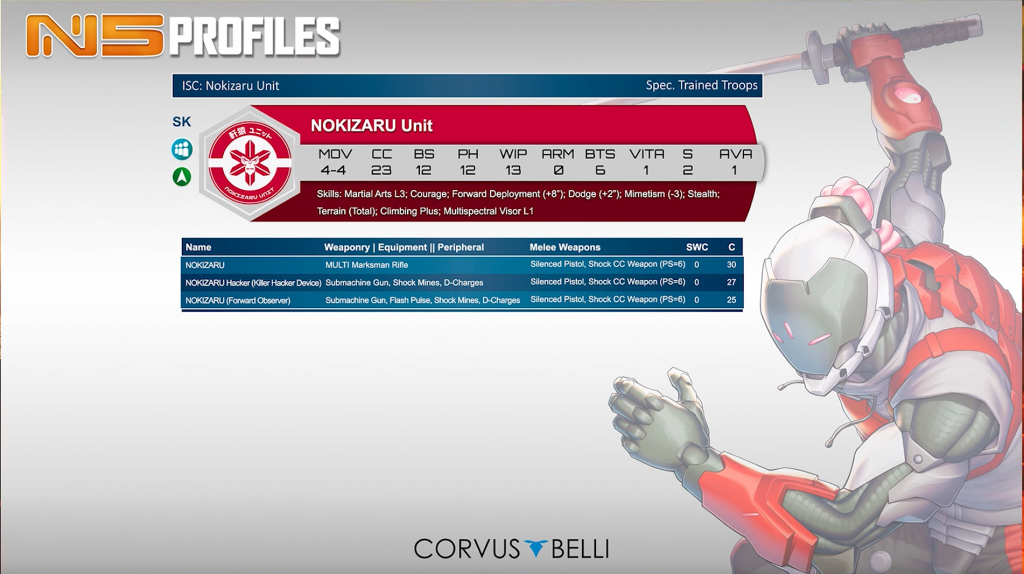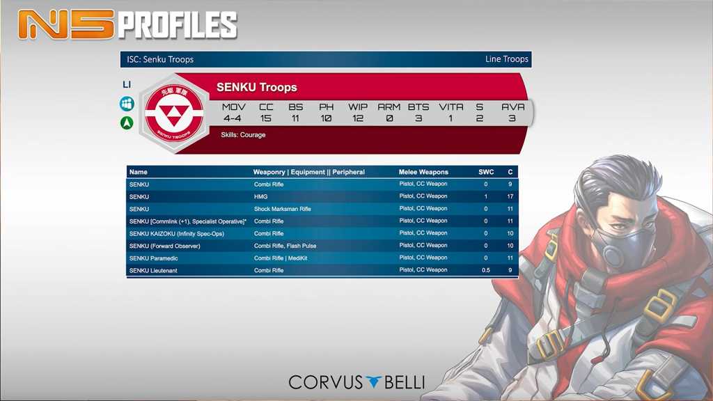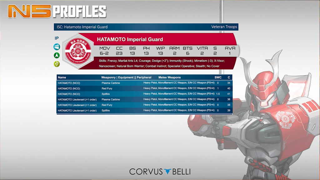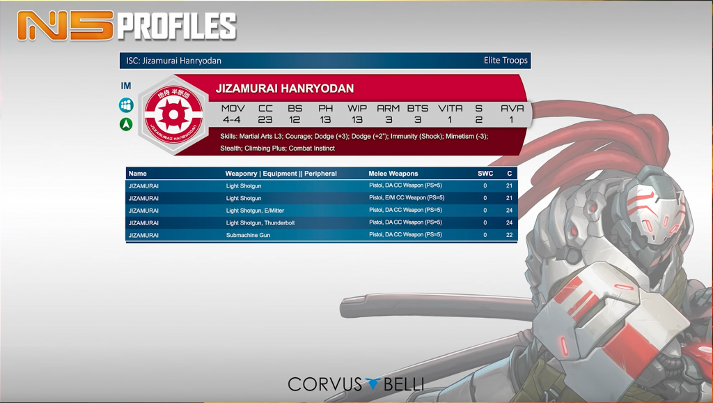 These are mostly very standard, combi rifle toting line infantry. It’s nice to be 9pts base, although the stats do reflect that. The paramedic, and to a lesser extent other specialist profiles, will all no doubt play a role. That’s all the good news. Unfortunately their Lt option is 0.5SWC (remains to be seen if there is any distinction between generic JSA and Shindenbutai), they don’t have any hacker option, or any ARO-centric SWC weapon, not that we consider those a hopeful prospect for line infantry in N5. Overall serviceable, but looking very dull compared to the more esoteric profiles Fennec Fusiliers received.