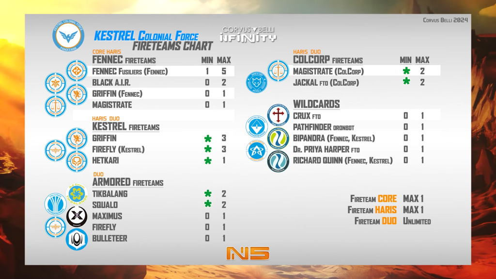 Second, how Fireteams count their bonuses is changing. In N5 it only matters how many of the same trooper you have in the team. Three Fusiliers in a Core team, receive the same bonuses as three Fusiliers and two Wildcards. Another unit can still have (Fusilier) denoted in its faction’s Fireteams chart, in which case it would count as a fourth model. As now, the type of team makes no difference to bonuses received, those are only dependent on the number of models - so a two-model Duo receives the same bonuses as a two-model Core. Let’s look at what these bonuses actually are: