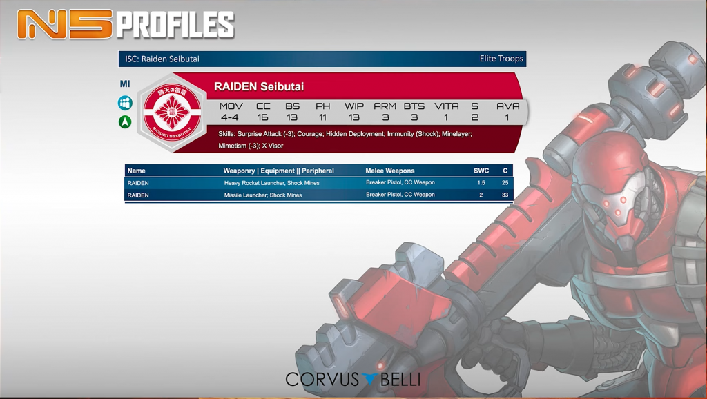 Hidden deployment impact templates - that’s the good stuff. The Raiden is a classic piece and just having it is a boon to the factions, because opponents have to respect the threat. 2SWC on the ML profile is rough, though. Minelayer is a troublesome skill on a Hidden Deployment model. Especially if a faction has no Mimetism-3, Camouflaged models likely to deploy standing up in its DZ, that mine will telegraph the presence of the Raiden loud and clear. But, that opens some interesting mind games. Minelayer is optional. Opponents might assume that no mine means no Raiden, lulling them into a false sense of security. Or, if the faction has any other Hidden Deployment minelayers, they could bluff the presence of a Raiden to scare off attacks, or a savvy player could put a mine in ZoC of one obvious ARO position, and actually place the Raiden covering another lane. This is a fun troop, as well as a sick model.