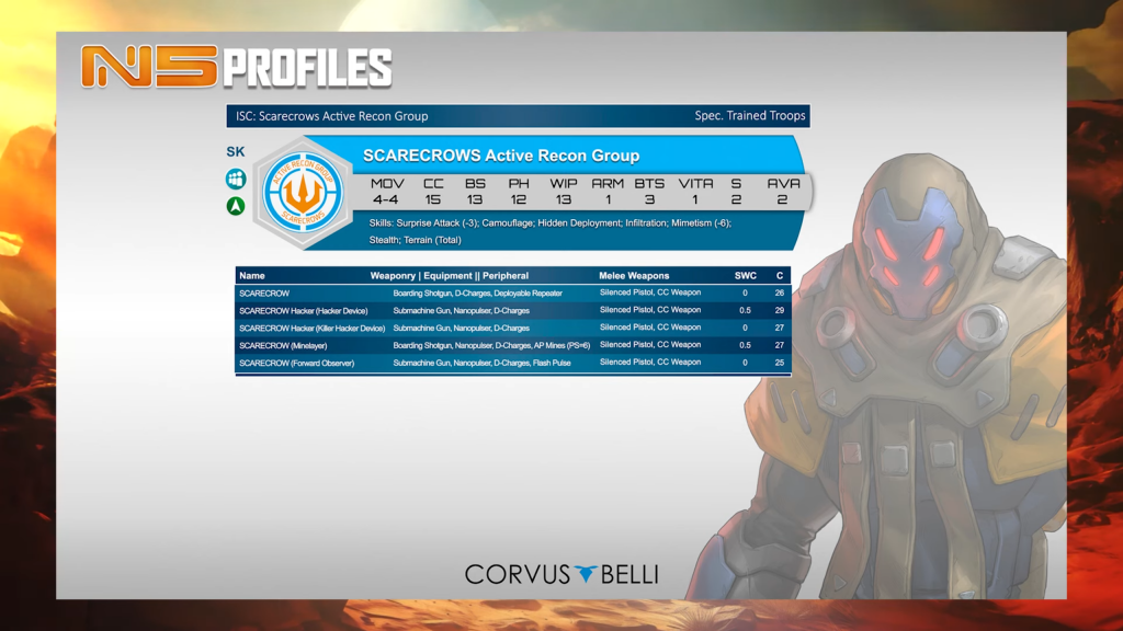 Well, a surprise like this perhaps. The Scarecrow is a Camouflaged, Hidden Deployment, Mimetism-6 Infiltrator, but with BS13. That means it can absolutely fight anything short of a TAG, as long as it doesn’t come up against any template weapons - all of its options are rather short-ranged. This seems like a good specialist and a way to ambush enemy teams coming through the midfield. As with all 1W, short range skirmishers, it is depending on a decrease in the number of direct template weapons in N5 to reach true greatness.