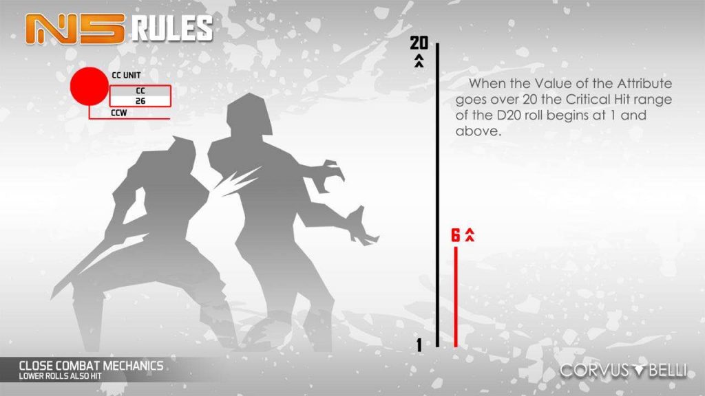 Out first impression was that this makes melee specialists even more likely to beat untrained models once they make it into Silhouette contact. A model rolling on CC 26 still has the same chance to crit. The crit results are replacing low rolls now, which we thought made CC >20 stronger - but a key facet is that skills >20 now don't directly modify the number you roll. E.G. if a model rolls on a 26, 1-6 are crits. But a roll of 7 isn't converted to 13. So mathematically it remains basically the same as before.