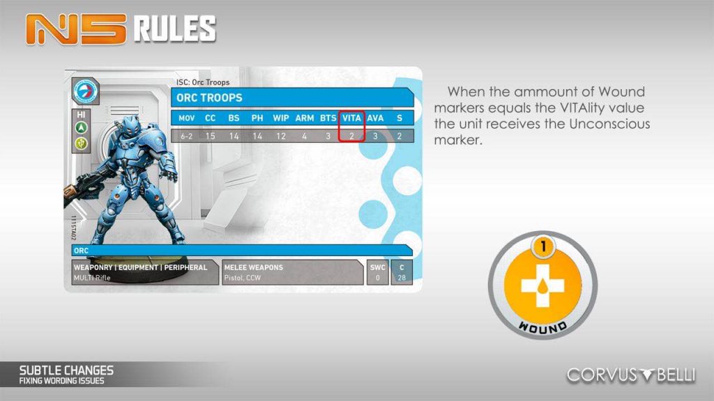 The seminar did show an explanation of two changes to nomenclature, which we were already following: firstly, Wounds is becoming Vitality. Perfectly simple, and ‘wound markers’ are still referred to, when they equal the model’s Vitality stat, the model becomes Unconscious. Structure is remaining the same term, the chance only seems to have been introduced because of the ambiguity between "wounds" as a stat and "wound markers".