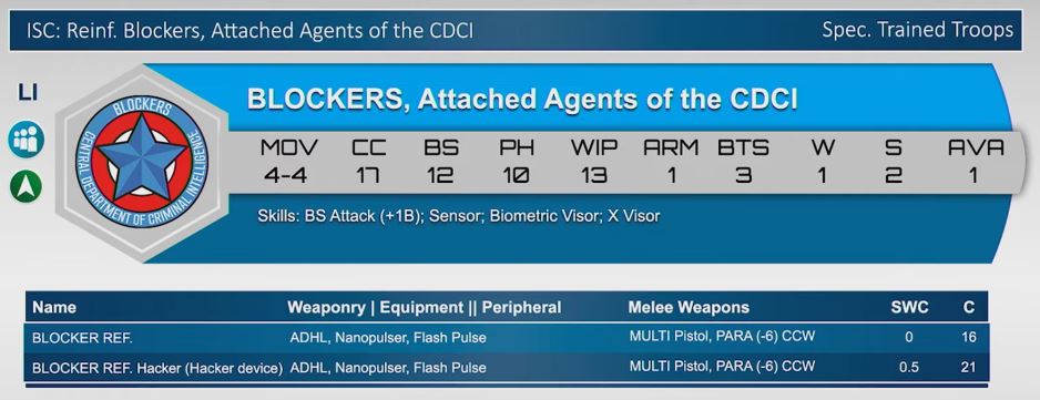 Genghis Cohen: An unusual utility support unit. Sensor is definitely their biggest skill, a great tool to have arrive into the midfield. BS Attack (+1B) and X-Visor would really elevate common weapons, but the Blockers have saved some points costs by only having non-lethal options beyond 8" effectiveness. A multi-pistol+1B is nice, but even with an X-Visor it's not really good beyond 8". Their weapons do make them well suited to outshooting or trading with Camouflage models they've flushed out with Sensor however. Biometric Visor is situational at the best of times and nigh useless on a Reinforcement - most Impersonators will have their plays resolved one way or another in Round 1, before they arrive.