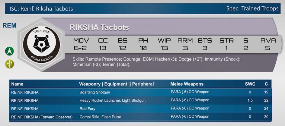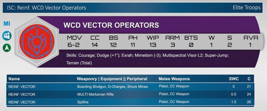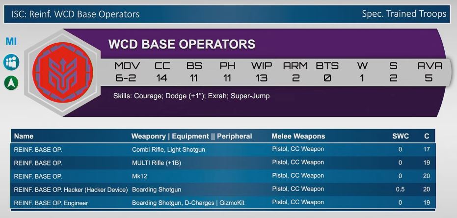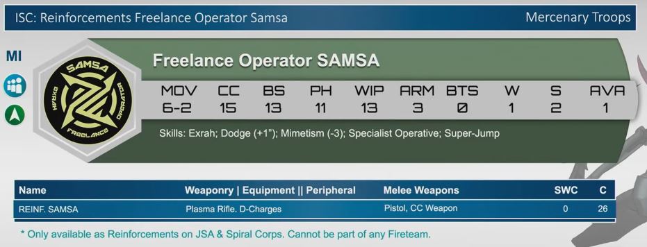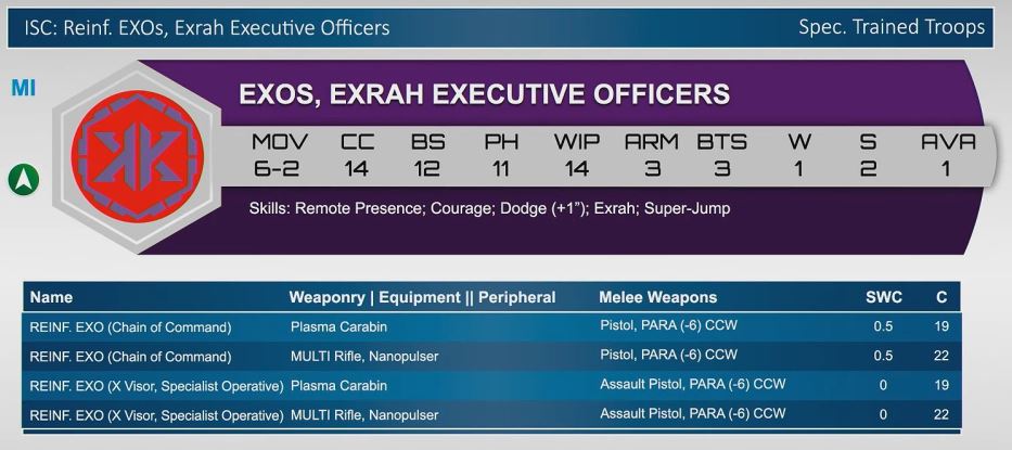 before your Reinforcements arrive* but at least they've costed it appropriately (note how the CoC profile costs as much as their Specialist Operative, which is usually +1 point). That said, honestly these are great profiles. Super-Jump on a 6-2 chassis with a BS 12 Plasma Carbine/Multi Rifle is very nice for the price you're paying for it. We'll have to see the full Exrah rule before I'm willing to comment on its interactions with Remote Presence, though.