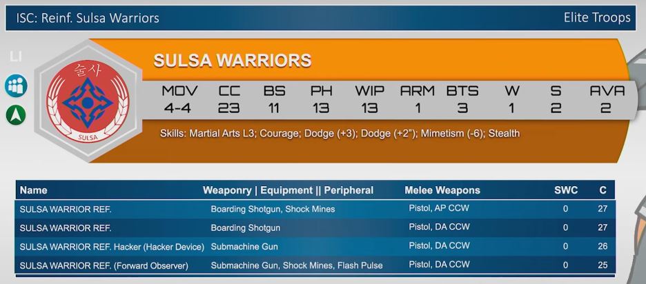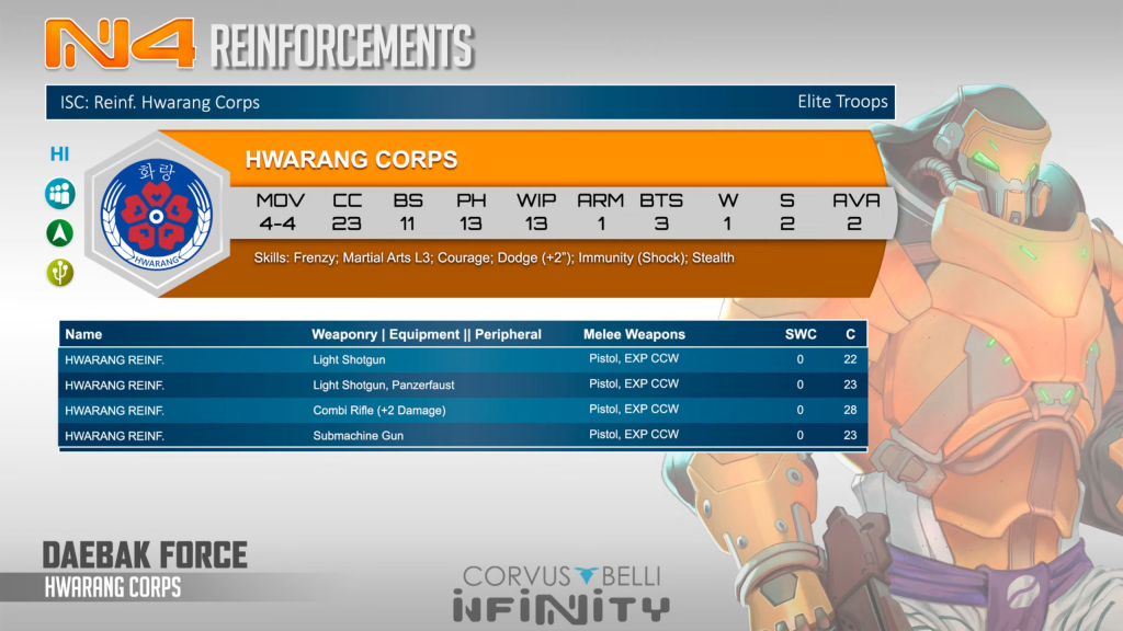 Genghis Cohen: Note the errors in the picture above, seemingly caused by a copy/paste error. In fact Hwarang are very solid cheap HI with a Close Combat focus (CC 22, Martial Arts 3 and EXP CCWs). This sort of cheap melee-focussed HI is a design space CB has been exploring recently. Take HI, push their stats down a bit in some areas, give them a super-cheap primary ranged weapon and maybe a disposable long-range weapon, pump up the melee skills. Boom, cheap 2W models, which can be super useful as road blocks or as assault troops. These guys are not quite as optimised as Teutons, Tankos or Cenobites - but none of those guys can start in a Fireteam on the halfway line! A really useful addition to Reinforcements, especially as filler in a team with better gunfighters.