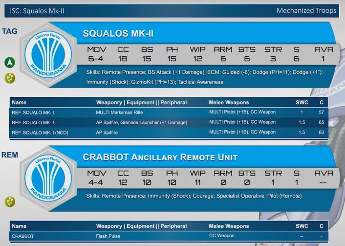Genghis Cohen: Only 2 profiles here - as 1W models with Mimetism-3 and BS Attack (Shock), you'd expect these to be gunfighters. In fact they get a plain boarding shotgun profile, which isn't very interesting - template range being a very difficult space for such units to exist in - and a nifty SMG-toting Engineer with Tactical Awareness. This is a terrific profile for PanO, a faction with Remote Awareness TAGs, to have as support. The only downside is although they can form a Duo, you can't realistically fit it alongside the Squalo Mk2 in the actual Reinforcements group due to points cost. It doesn't appear you could even fit in a 3rd model alongside them, so for Orders you'd be leaning heavily on their ability to feed 2 TacAware and 1 NCO Orders into the Duo.