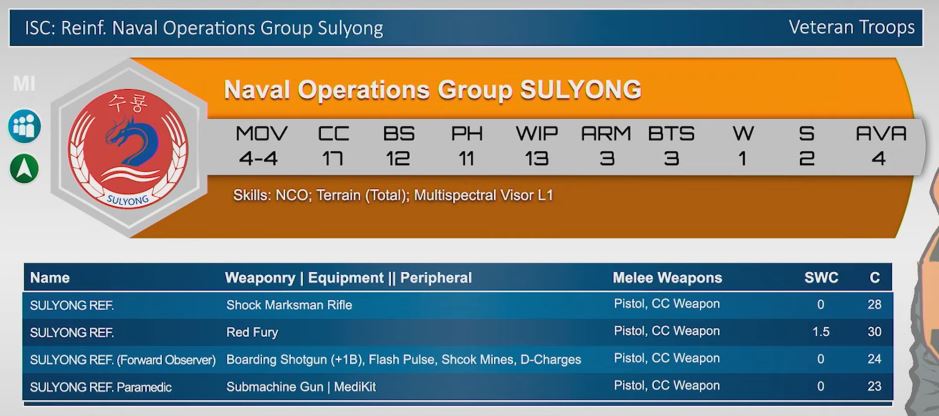 Genghis Cohen: These are classic Medium Infantry. MSV1 NCOs with some light shooting (shock marksman rifle or red fury) and some utility specialists with shorter ranged Weapons. Personally, I am not a fan. They're cool and usable, but fall into what some call a trap zone of points costs. 23-30pts is not enough to get a punchy attack piece, but too much to be disposable for trades, or a cheap Fireteam filler. They're just not a key unit type you want. Everyone needs gunfighters, but a shock marksman or red fury at BS12 doesn't cut it, even with MSV1. I'm more positive about the Forward Observer and Paramedic options, especially in Reinforcements where they can start in the midfield. They could have a use hunting Camouflage or Mimetism skirmishers, but mostly I think their value is folded into Fireteams to support other units - NCO is valuable there.